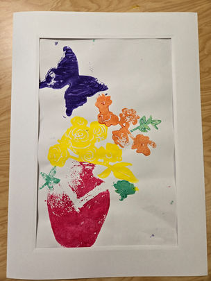 Second grade students using wooden shapes to makeFlowers printmaking.